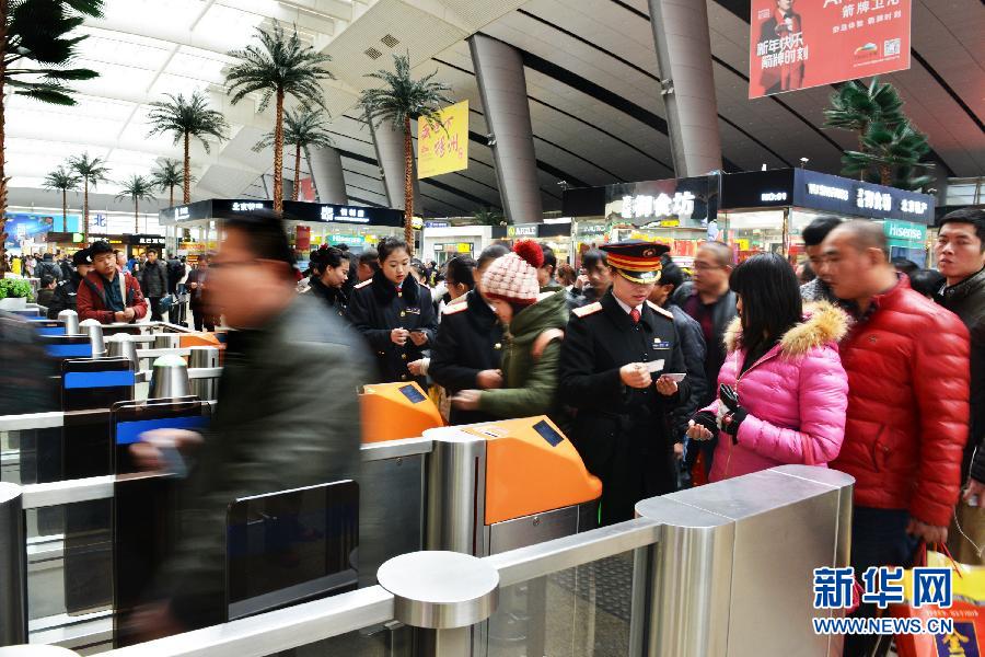 1月26日,乘坐京沪高铁的乘客在北京南站检票进站。据中国铁路总公司统计,2014年京沪高铁运送旅客超过1亿人次,日均发送旅客超过29万人次,比上年同期增长27%,日均高铁列车运行超过250列,运营3年首次实现盈利。新华社发(杨宝森 摄)
