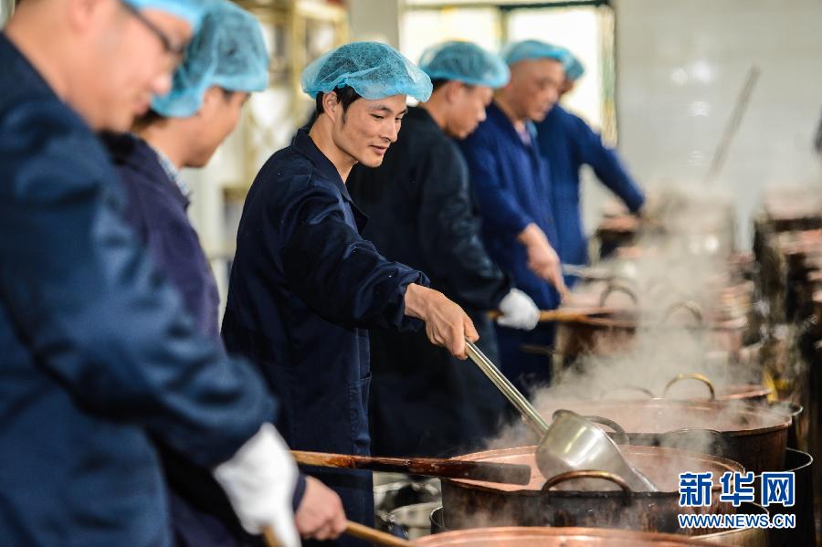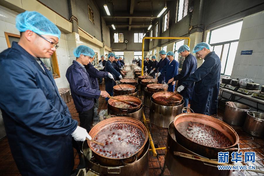 1月26日,近30名工作人员用传统的铜锅熬制腊八粥。
