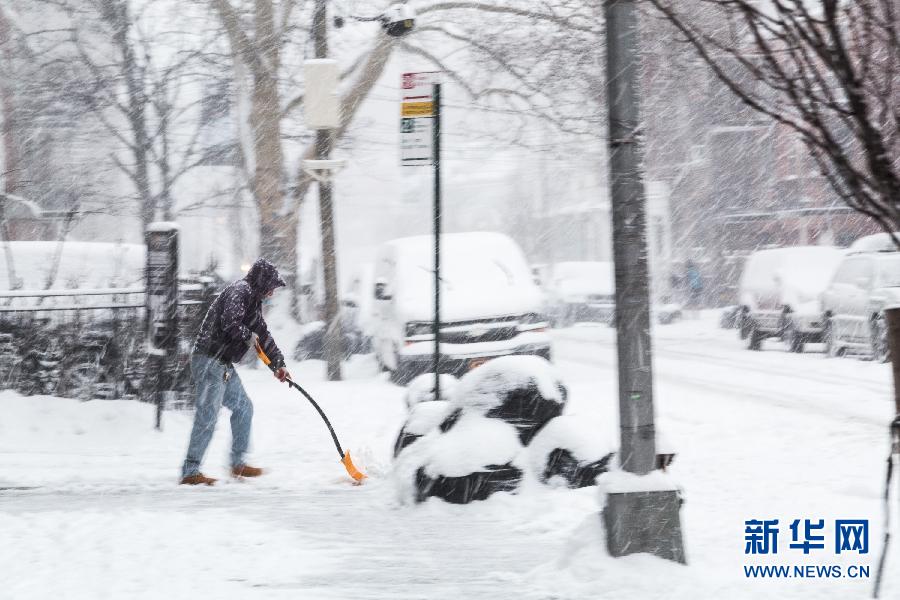 1月26日,在美国纽约皇后区,一名男子正在清扫自家门前的积雪。美国东北部自26日开始迎来一场暴风雪。美国国家气象局说,这场暴风雪将给美国东北部地区带来最高约90厘米降雪和强风。这一天气将持续到28日。 新华社记者 李畅翔 摄
