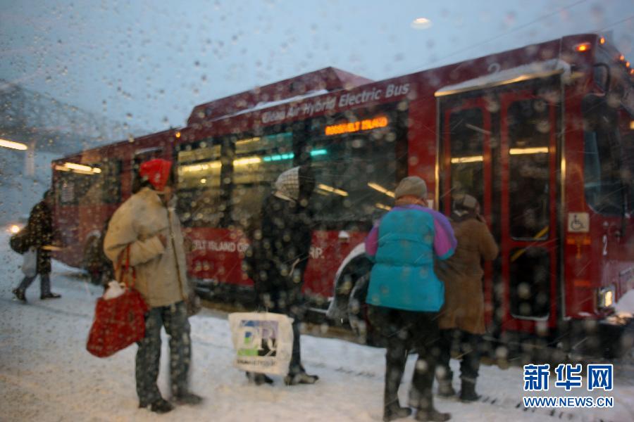 1月26日,在美国纽约,居民在罗斯福岛的公交车站乘车。