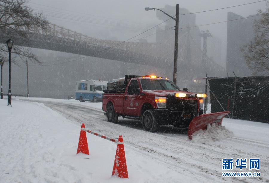 1月26日,在美国纽约,铲雪车在罗斯福岛上清除积雪。