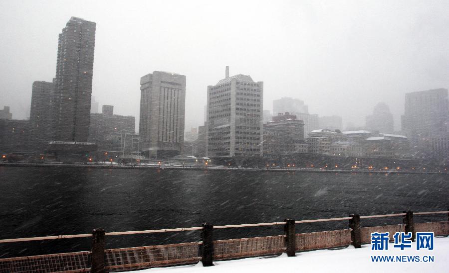 1月26日在美国纽约罗斯福岛上拍摄的曼哈顿雪景。