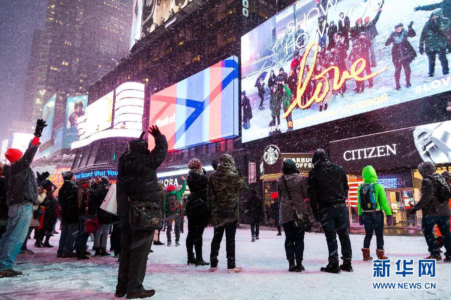 1月26日,在美国纽约曼哈顿时报广场,游客冒雪观看大屏幕广告。美国东北部自26日开始迎来一场暴风雪。美国国家气象局说,这场暴风雪将给美国东北部地区带来最高约90厘米降雪和强风。这一天气将持续到28日。 新华社记者 李畅翔 摄