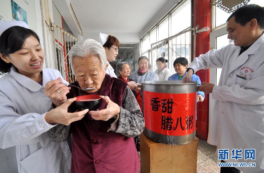 1月27日,一位老人品尝河北省邯郸市第二医院的医护人员送来的腊八粥。