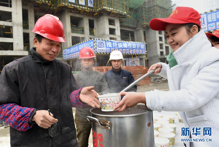 1月26日,在安徽省合肥市瑶海区木器厂棚户区改造建设工地上,社区志愿者为辖区建设工地的外来务工人员送上腊八粥。