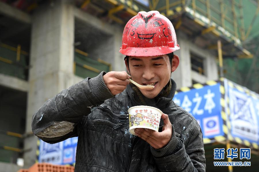 1月26日,在安徽省合肥市瑶海区木器厂棚户区改造建设工地上,一名外来务工人员在品尝腊八粥。