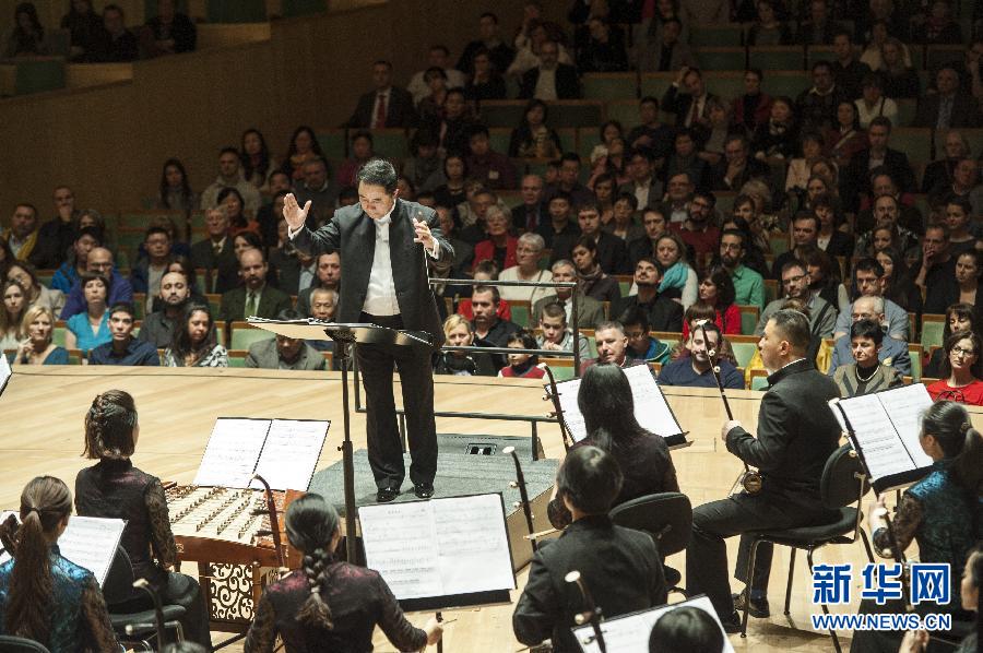 1月26日,在匈牙利布达佩斯艺术宫巴托克·贝拉国家音乐厅,上海民族乐团团长、指挥家王甫建(中)在中国春节民族音乐会上指挥上海民族乐团。布达佩斯是上海民族乐团此次欧洲巡演的第一站。在未来两周,乐团将赴奥地利、瑞士、德国和荷兰等国继续巡演。 新华社发(凯奇凯梅蒂·达维德摄)