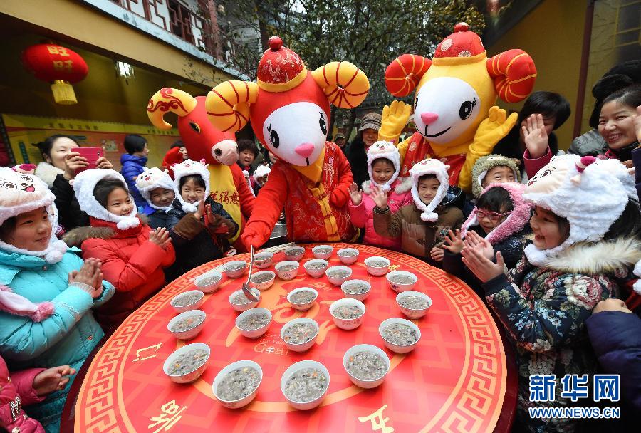 1月27日,义工装扮的“吉祥羊”在南京玄奘寺的赠粥仪式上盛腊八粥。当日是传统腊八节,不少地方纷纷举行发放腊八粥活动,为市民赠粥送祝福。 新华社记者孙参摄