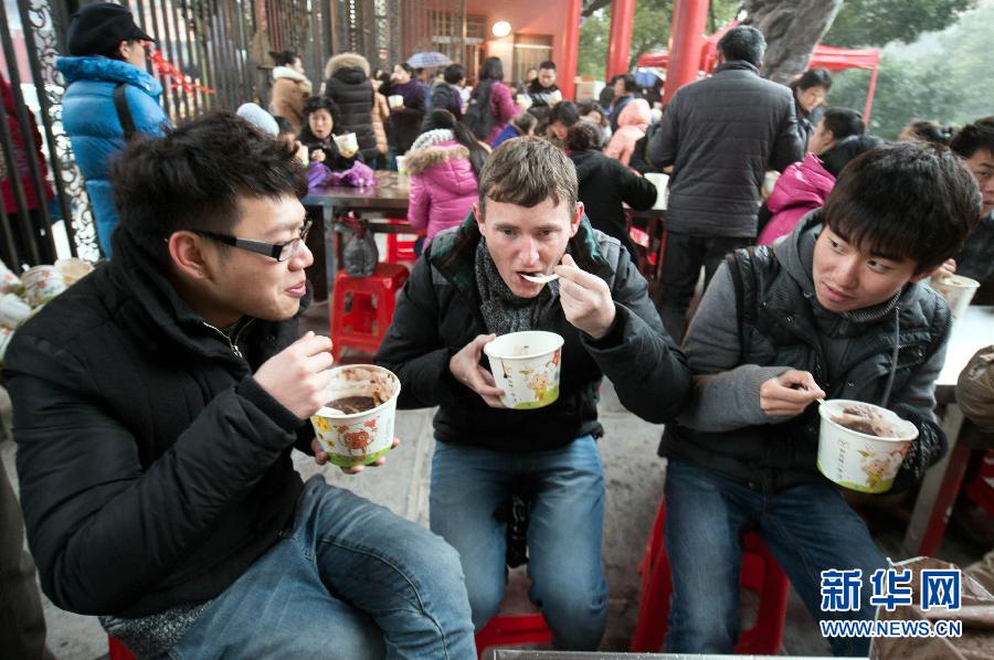 1月27日,在合肥开福寺内,一位加拿大游客(中)与他的中国朋友一起品尝腊八粥。