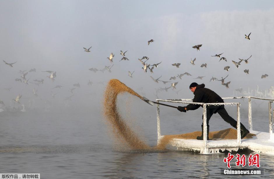 当地时间1月26日,俄罗斯阿尔泰地区Urozhainy小镇的一处湖泊,六百多只天鹅迁徙到此过冬。图为人们往湖中撒食物喂食天鹅。