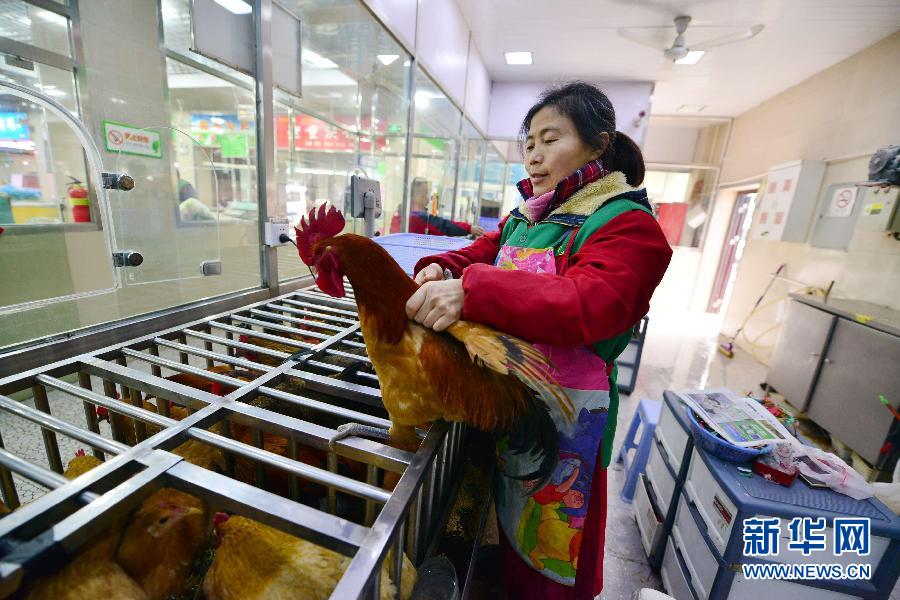 1月26日,在上海市虹口区三角地水电菜市场内,一名工作人员从笼中取出一只公鸡。日前,上海市商务委下发通知,2015年2月19日(农历正月初一)至4月30日,全市将实行季节性暂停活禽交易。据悉,目前上海共有130个活禽交易点,覆盖各个区县,其中,静安、杨浦、黄浦、闵行等四区的27家活禽交易点目前已经关闭。新华社发(沈春琛 摄)