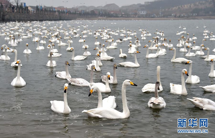 1月27日,天鹅在山东省荣成市的沿海水面栖息。
