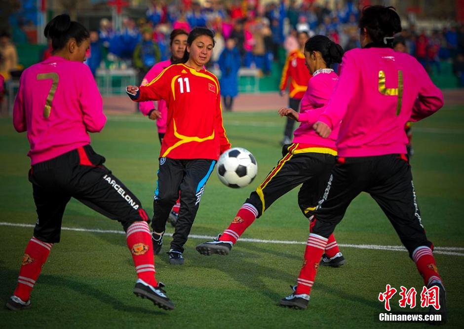 据介绍,足球运动在和田地区中小学中已被广泛普及,青少年对足球运动的热爱空前高涨。女学生也深受感染,走出家门参与到足球运动当中。本次比赛,该地区青少年足球队由原来的21支队伍,发展到37支队伍参加比赛,女子足球队也由原来的8支增加到19支。图为首场比赛在两支女子队之间来开帷幕,和田市第四中学女子队(红衣)对阵吐沙拉乡中学女子队。 刘新 摄