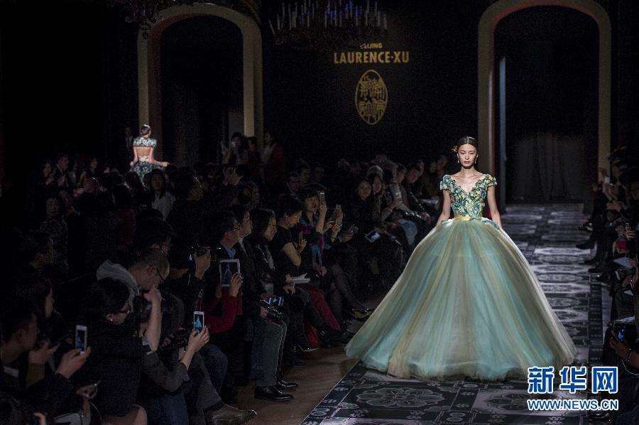 1月27日,在法国巴黎,一名模特身着《敦煌》主题礼服走秀。当日,由中国设计师劳伦斯·许创作的时装作品《敦煌》在巴黎2015春夏高级时装周亮相。 新华社记者陈晓伟摄
