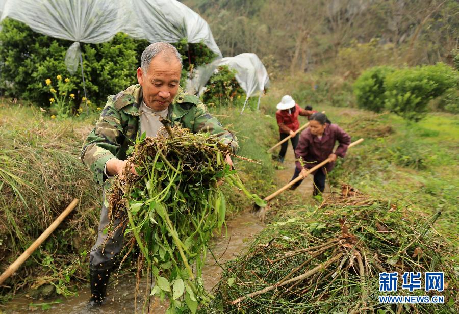 1月27日,在广西柳州市融安县沙子乡石岩屯,返乡农民工在清理沟渠。 2015年春运前夕,广西柳州市融安县的大批外出务工人员选择错开春运高峰期提前返乡,抢抓立春前的时间开展修筑水渠、加固堤坝等农用水利设施兴修工作,确保外出务工不误春耕生产。新华社发(黄国良 摄)