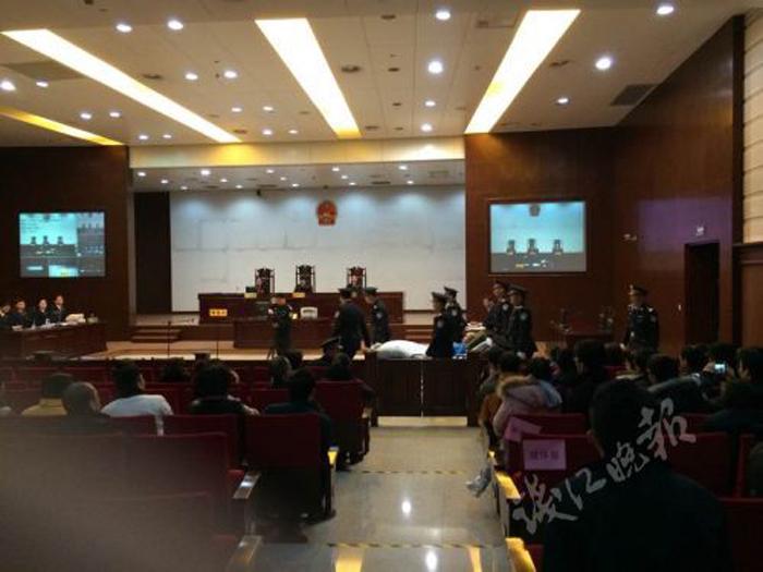 1月28日上午九点,杭州“7·5”公交车纵火案将在杭州市中级人民法院一号法庭开庭审理。图为躺在病床上出庭的被告人包来旭。 董旭明 摄 图片来源:钱江晚报