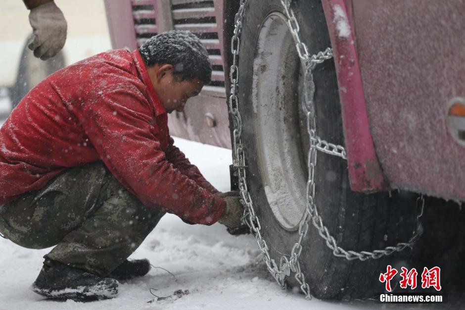 1月28日,河南南阳汽车站,司机正在给车辆轮胎安装防滑链。1月27日下午及夜间,河南省的南阳、信阳、驻马店和洛阳等南部及西部地区迎来了大范围降温降雪天气,其中沿黄及以南大部分地区累计降雪量达10到15毫米。受冷空气和降雪的影响,出现了道路积雪、结冰等情况,给交通运输和市民出行带来较大影响,气象部门提醒人们做好防范。中新社发 杨正华 摄