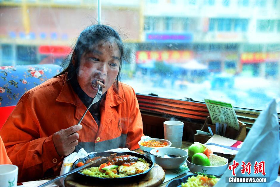 环卫工林友珠也是第一次吃上牛排。 蔡起辉 摄