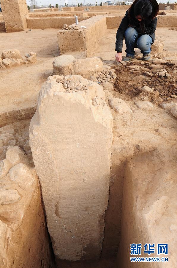 工作人员在陕西周原遗址残存的亚字形社主石基座旁进行清理工作(2014年12月31日摄)。新华社记者丁海涛摄
