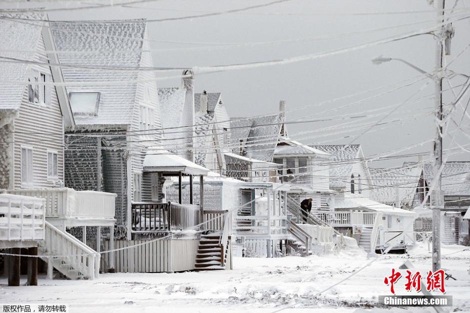 图为马萨诸塞州的锡楚埃特(Scituate)小城在海浪和暴风雪的夹击下遭遇冰封厄运。