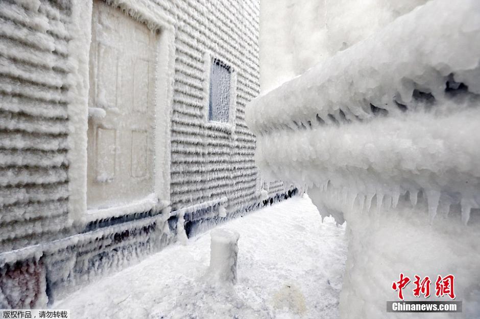 当地时间1月28日, 康涅狄格州沿海小城锡楚埃特(Scituate),房屋在风暴中遭遇冰封,房屋外面的冰层非常厚,居民们无法铲除。