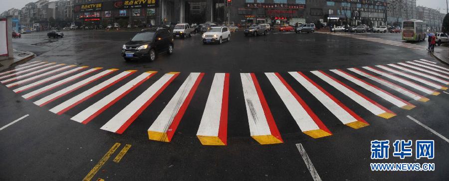 长沙开元西路的彩色“立体”斑马线(1月29日摄)。近日,一组彩色“立体”斑马线在湖南省长沙市开元西路亮相,这些斑马线不是单一的白色,而是由白、红、黄三色组成,远远看去如同一根柱子,给行人和司机强烈的视觉刺激。交警表示,希望通过这种设计提醒司机注意,减速慢行。新华社记者龙弘涛摄