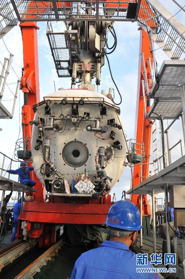1月29日,“蛟龙”号载人潜水器正被吊起。当日,中国载人潜水器“蛟龙”号在西南印度洋执行2014-2015年“蛟龙”号试验性应用航次(中国大洋35航次)第三航段首次下潜,这次下潜将回收在海底布放了17天的高温探头,并采集硫化物、生物和地质样品等。新华社记者张旭东摄