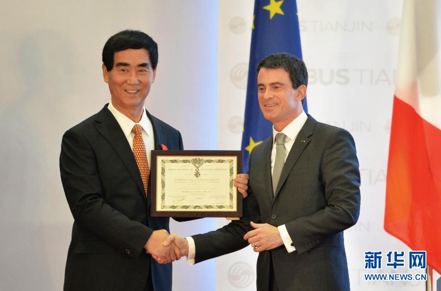 1月29日,法国总理马努埃尔·瓦尔斯(右)向原四川航空集团公司董事长蓝新国颁发法国荣誉军团骑士勋章。当日,法国总理曼努埃尔·瓦尔斯在天津参观空中客车A320系列飞机总装线并出席在空客天津园区举行的相关合作交流活动。应中国国务院总理李克强邀请,法国总理曼努埃尔·瓦尔斯于29日至31日对中国进行正式访问。 新华社记者 刘海峰 摄