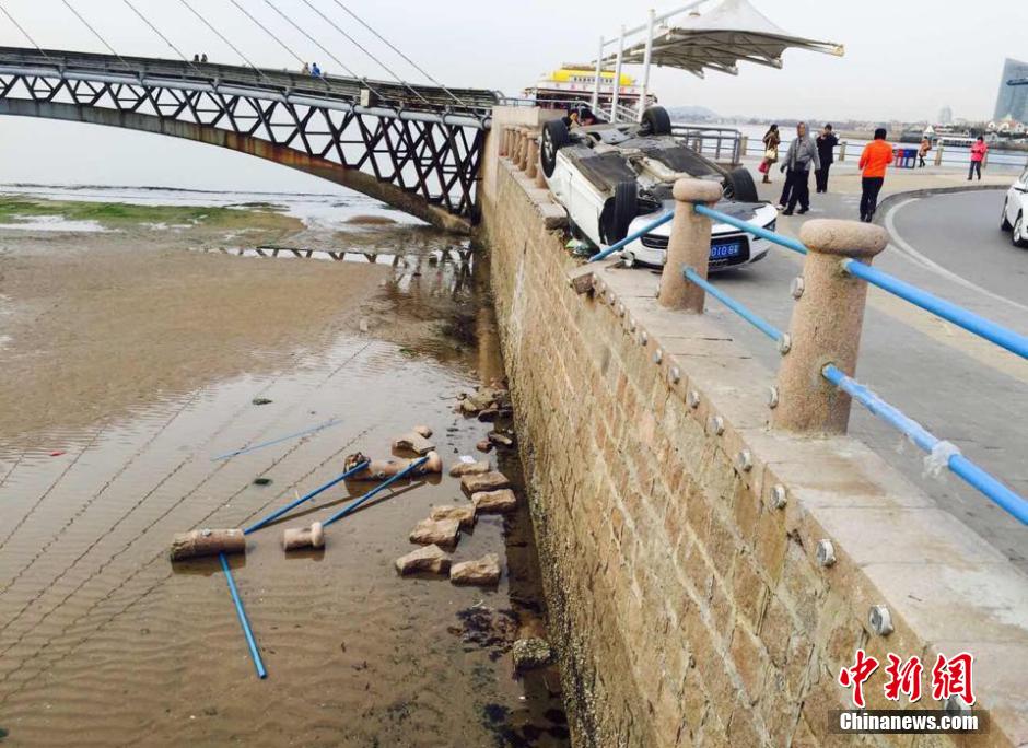 1月29日,很多上班的市民看到青岛澳门路海边转弯处一辆奥迪车撞破护栏翻在岸边,仅差半米就掉进大海,场面惊险。据悉,驾驶员不知去向,周围的人不清楚事故具体发生时间。 中新社发 CNSPHOTO 摄