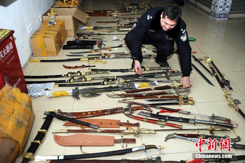 2015年1月29日,乌鲁木齐市,五家商户主动上缴刀身长度超过22厘米以上的各类管制刀具2100余把。今后,乌市公安部门还将联合工商、质监等部门加大对刀具生产、销售环节的检查整治,落实刀具销售实名登记、刀具激光打码、人刀分离(购买的刀具必须邮寄)等制度,实现刀具销售完整的流向监控。同时,针对非法持有管制刀具和非法销售管制刀具等违法行为加大打击力度,全力确保社会治安稳定。图片来源:CFP视觉中国