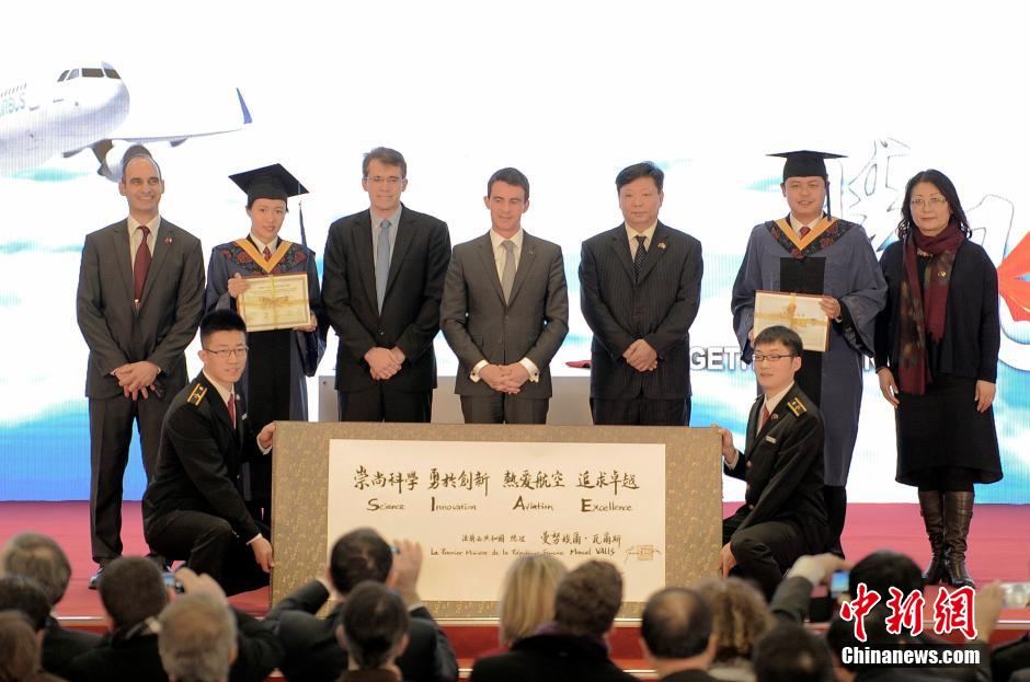 1月29日,抵达中国进行访问的法国总理马努埃尔.瓦尔斯来到空中客车A320系列飞机天津总装线进行参观,并出席了在空客天津园区举行的两项象征中法合作与交流的活动。图为法国总理瓦尔斯出席中欧航空工程师学院学生毕业典礼。中新社发 佟郁 摄