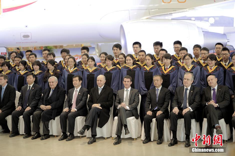 1月29日,抵达中国进行访问的法国总理马努埃尔.瓦尔斯来到空中客车A320系列飞机天津总装线进行参观,并出席了在空客天津园区举行的两项象征中法合作与交流的活动。图为法国总理瓦尔斯出席中欧航空工程师学院学生毕业典礼。中新社发 佟郁 摄