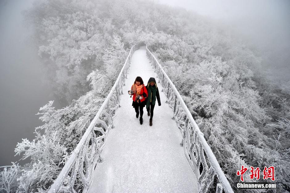 2015年1月29日,湖南省张家界天门山风景区出现迷人的雾凇景观,壮美如画宛如童话世界一般,银装素裹的景色吸引了众多游客前来观赏并拍照留念。28日,受冷空气影响,湖南张家界天门山风景区迎来2015年首场降雪。中新社发 邵颖 摄 图片来源:CNSPHOTO