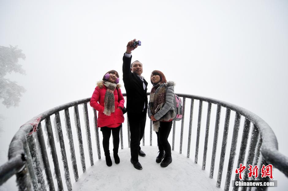 2015年1月29日,湖南省张家界天门山风景区出现迷人的雾凇景观,壮美如画宛如童话世界一般,银装素裹的景色吸引了众多游客前来观赏并拍照留念。28日,受冷空气影响,湖南张家界天门山风景区迎来2015年首场降雪。中新社发 邵颖 摄 图片来源:CNSPHOTO