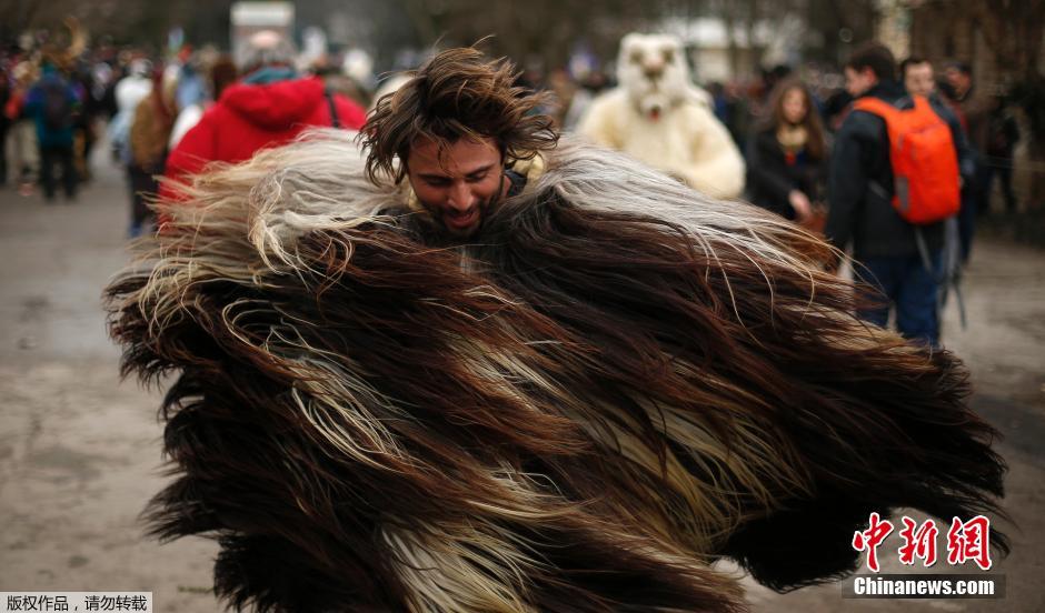 当地时间2015年1月31日,保加利亚贝尔尼克,民众穿动物皮毛服装跳舞游行,庆祝传统节日。这种被称为“Kuker”的舞蹈在当地人习俗中有“驱鬼”的寓意。