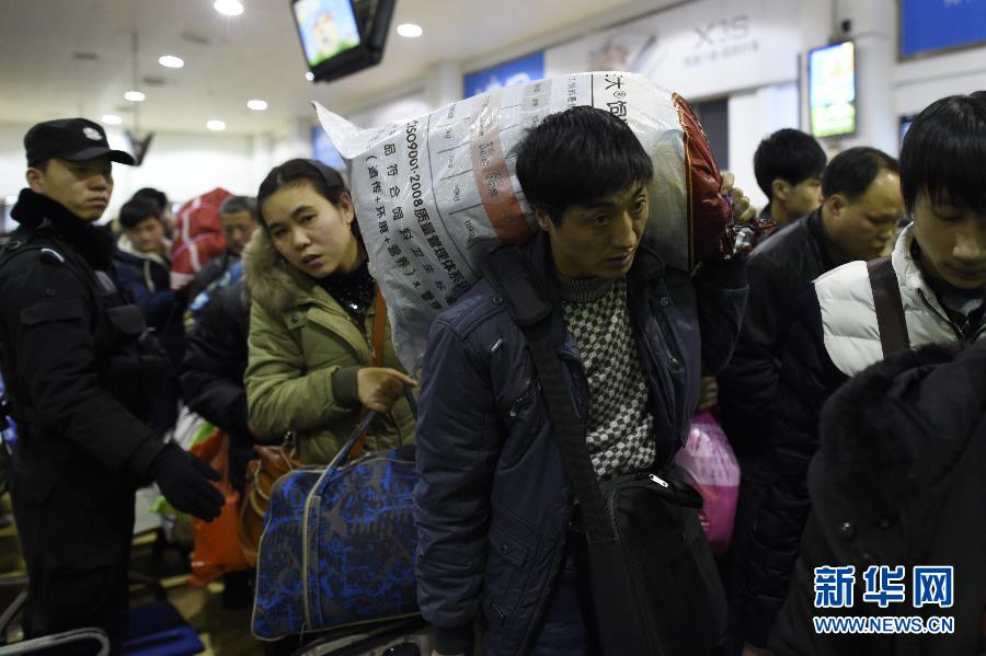 2月1日,乘坐K4173次临客的旅客在候车室内排队检票进站。