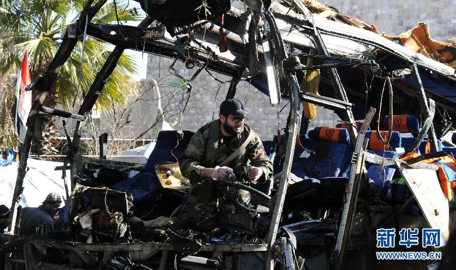 2月1日,叙利亚安全人员在清理现场。当地时间2月1日13时许,一辆50座的公共汽车在大马士革市中心哈米迪亚市场外发生爆炸,导致8名乘客死亡,至少22人受伤。叙安全人员随即封锁了现场,禁止人员进入。新华社记者 张迺杰 摄