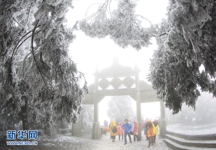2月1日,游客在南岳衡山上游览。连日来,持续的冰冻天气让位于湖南衡阳的南岳衡山呈现银装素裹的北国风光,群山树木被冰雪覆盖,美不胜收。 新华社发(曹正平 摄)