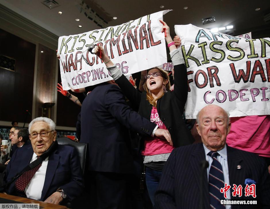 当地时间2015年1月29日,美国华盛顿,美国前国务卿基辛格和舒尔茨出席参议院军事委员会有关全球挑战和美国国家安全战略的听证会,遭到示威者闹场,一名女性示威者挥舞着手铐冲到基辛格面前,被保安拦下。