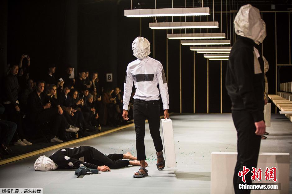当地时间1月29日,哥本哈根时装周,模特带头套T台走秀,其中一个展示环节,一名模特模拟遭枪击瞬间,扑倒在地。