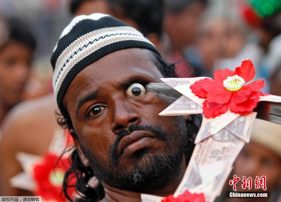 当地时间2015年2月1日,印度艾哈迈达巴德,穆斯林民众庆祝乌尔斯节。图为一男子用剑拨开自己的眼睛。