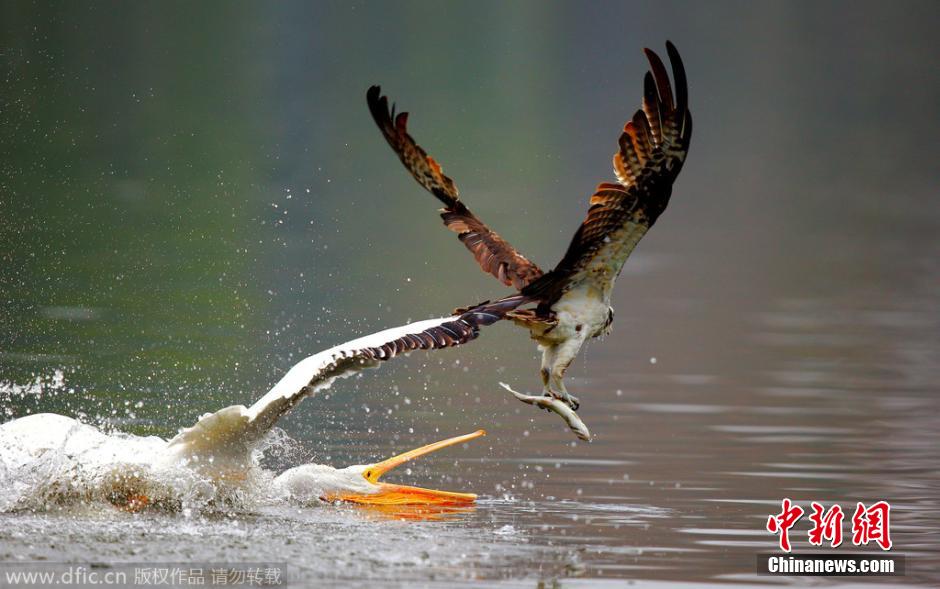 当地时间2015年2月2日报道,美国洛杉矶,一只懒惰的鹈鹕试图从鱼鹰口中抢夺食物,坐享渔翁之利,可惜最终失败了,还溅了自己一身水,非常狼狈。图片来源:东方IC 版权作品 请勿转载