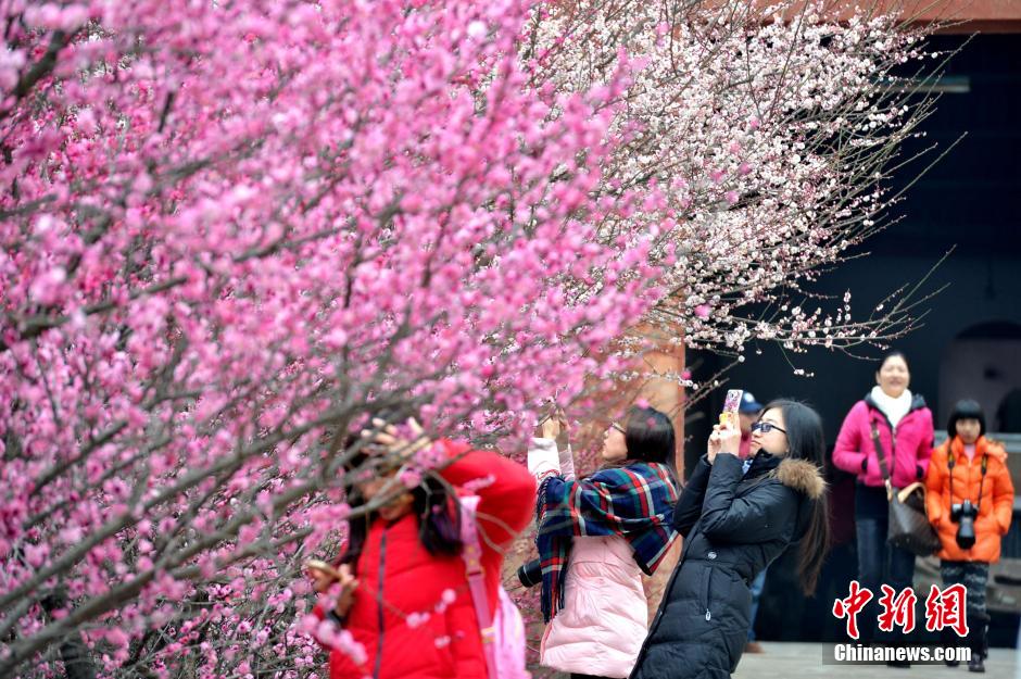 近日,位于福州北峰上的千年古刹林阳寺周围的500余株梅花相继绽放,妆点着千年古刹,美不胜收。1月31日,众多市民前来感受春的气息。中新社发 张斌 摄