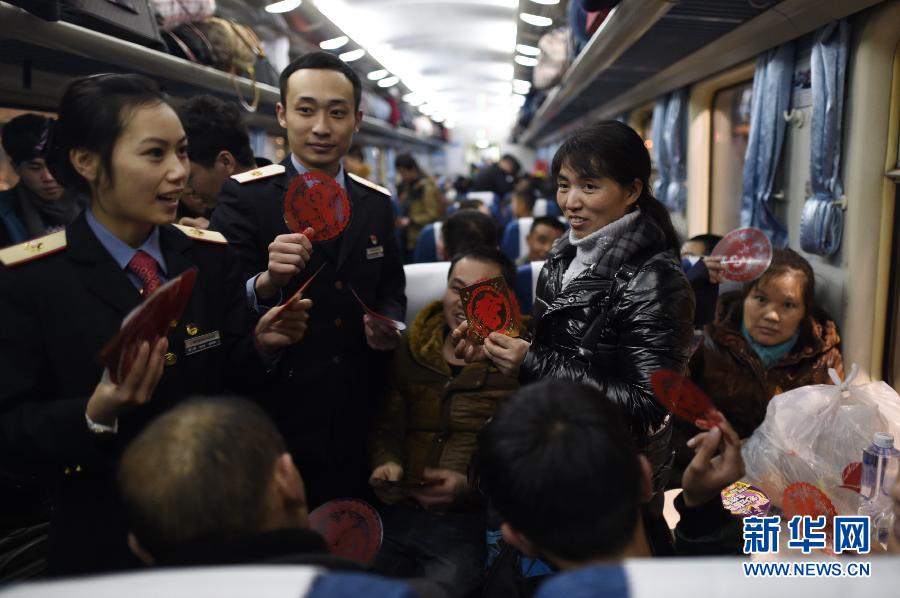 2月1日,乘务员在K4173次临客上为踏上返乡旅途的乘客发放福字。当日,为应对春运客流的到来,铁路杭州站正式开行杭州至重庆北的K4173次临时旅客列车,大部分乘客均为在浙江工作的外来务工人员。据了解,杭州直属站将在2015年春运前后增开83对临客列车。 新华社记者 鞠焕宗 摄