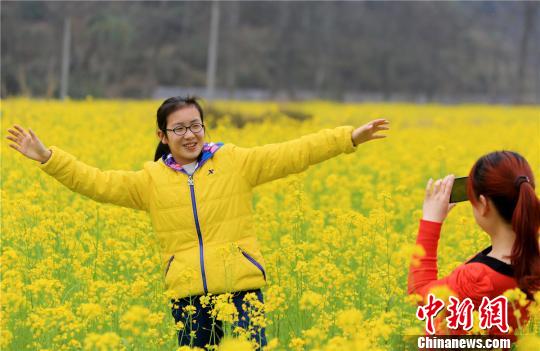 图为1月27日,在广西柳州市融安县沙子乡三睦村,两名游客在油菜花中拍照留影。 黄国良 摄