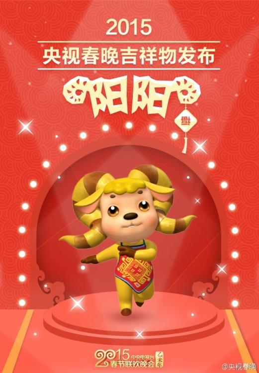 据2015央视春晚官方微博1月28日报道,央视羊年春晚吉祥物发布,阳阳,出生于“羊城”的名门之后!是有中国“国宝”、世界“超级羊”之称的小尾寒羊家族第108代嫡传子孙(也可能是132?168?……)33年春晚史上首个吉祥物,在除夕直播当天,“阳阳”将作为晚会特邀主持人与观众们见面。图片来源:2015央视春晚官方微博