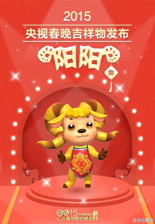 据2015央视春晚官方微博1月28日报道,央视羊年春晚吉祥物发布,阳阳,出生于“羊城”的名门之后!是有中国“国宝”、世界“超级羊”之称的小尾寒羊家族第108代嫡传子孙(也可能是132?168?……)33年春晚史上首个吉祥物,在除夕直播当天,“阳阳”将作为晚会特邀主持人与观众们见面。图片来源:2015央视春晚官方微博