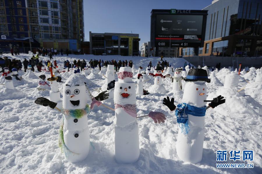 当日,近千名成人和儿童来到渥太华道明广场,参加冲击堆雪人吉尼斯世界纪录的活动。根据规定,每个雪人必须有双臂、双眼和鼻子。最终,参与者在1小时内共堆雪人1299个。2011年在美国盐湖城市举行的堆雪人活动共在1小内堆成雪人1279个。新华社发(大卫·卡瓦伊摄)