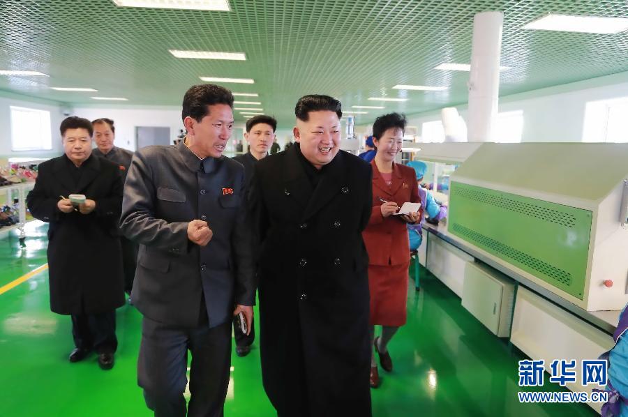 这张朝中社1月31日提供的照片显示,朝鲜最高领导人金正恩(前右)视察元山皮鞋厂。金正恩日前视察元山皮鞋厂注塑作业班、鞋帮车间和制鞋车间等生产工序和文化福利设施,具体了解改建和经营活动情况,并亲自测量了皮鞋的重量。新华社/朝中社