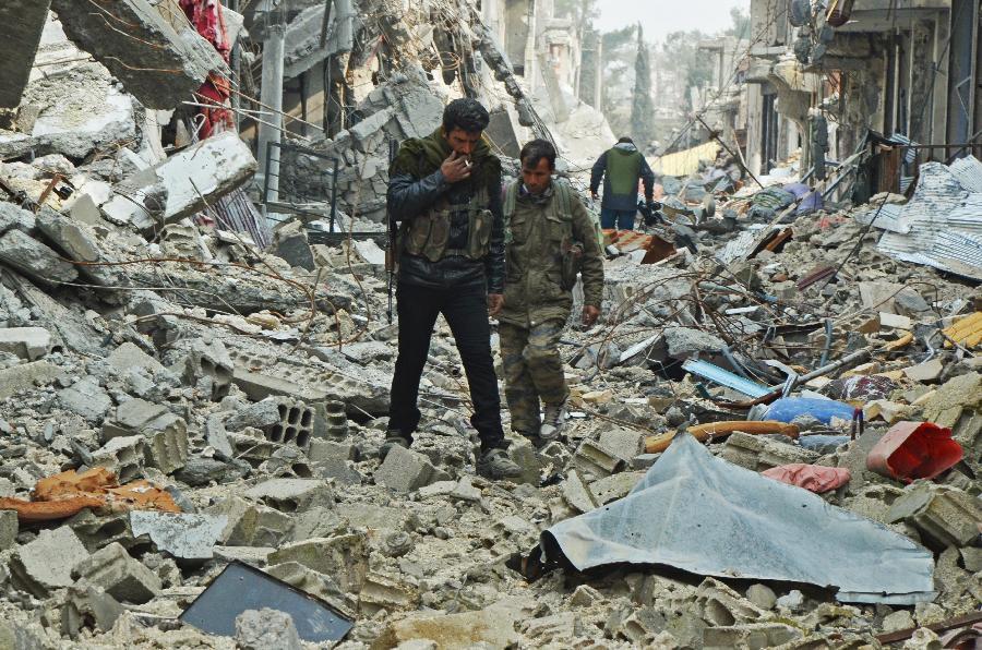 1月31日,在叙土边境重镇艾因阿拉伯,几名库尔德武装人员在废墟中巡逻。经过四个多月的战斗,库尔德人武装已经控制了与土耳其接壤的叙利亚重镇艾因阿拉伯,打击了极端组织“伊斯兰国”的嚣张气焰,也令逃亡土耳其的大批叙利亚难民重燃回乡的希望。然而,艾因阿拉伯面临的威胁仍未解除,整个小镇更是满目疮痍,严重损毁的艾因阿拉伯目前无力接收难民返乡,重建家园更是有待时日。 新华社/世界新闻通讯社